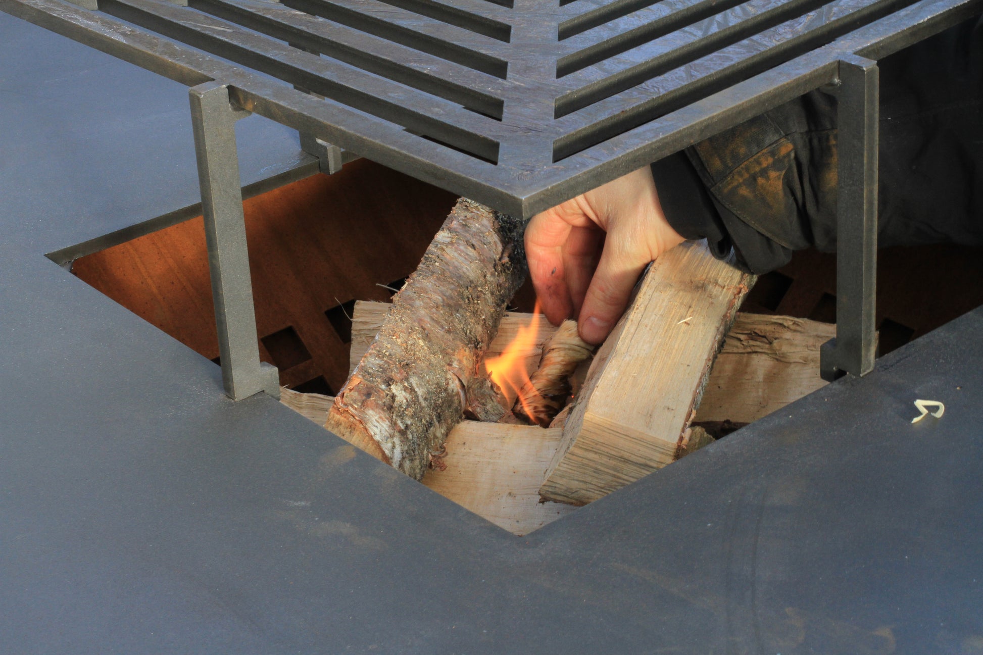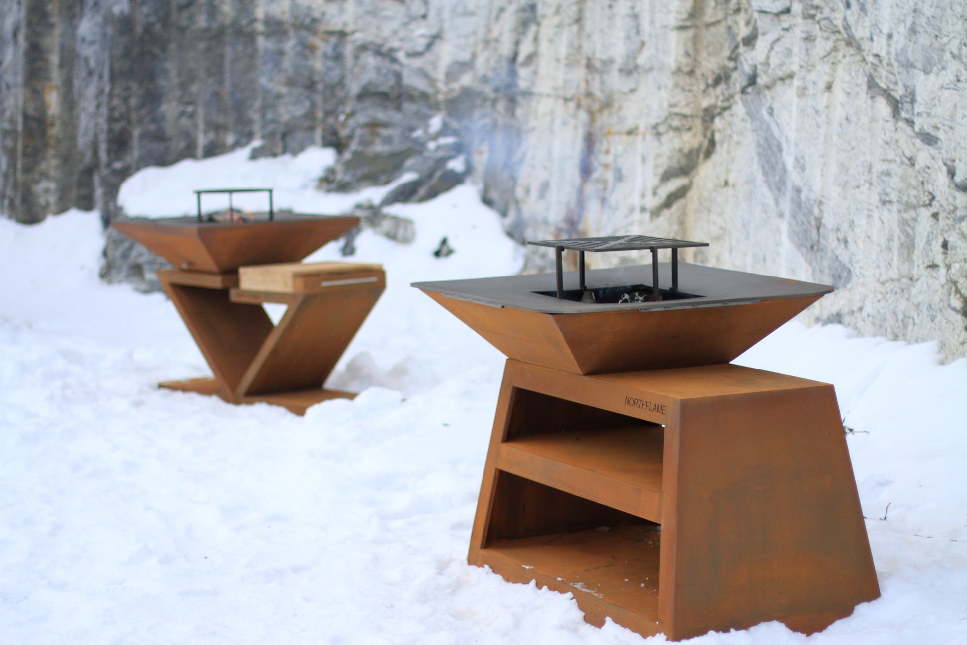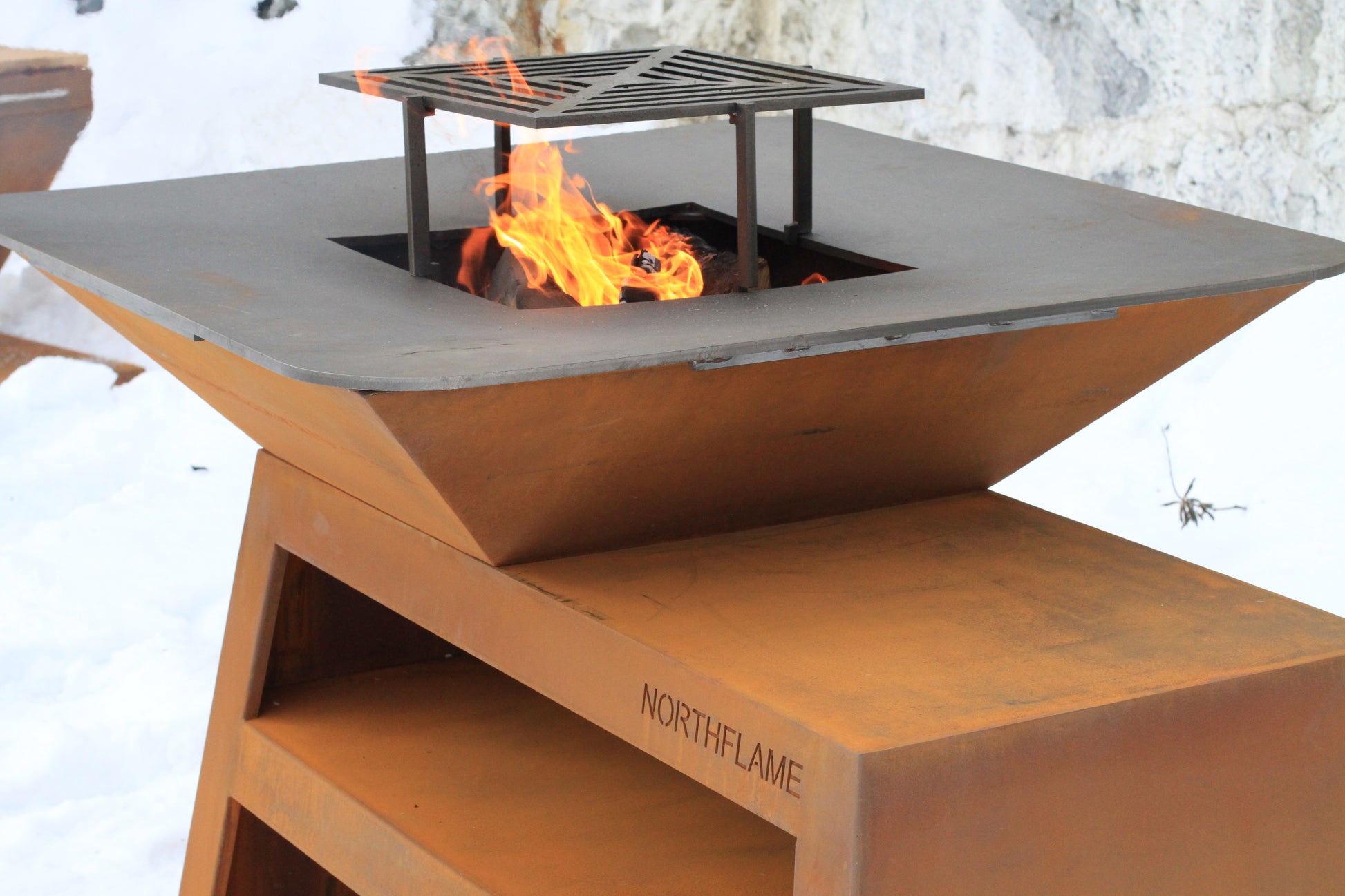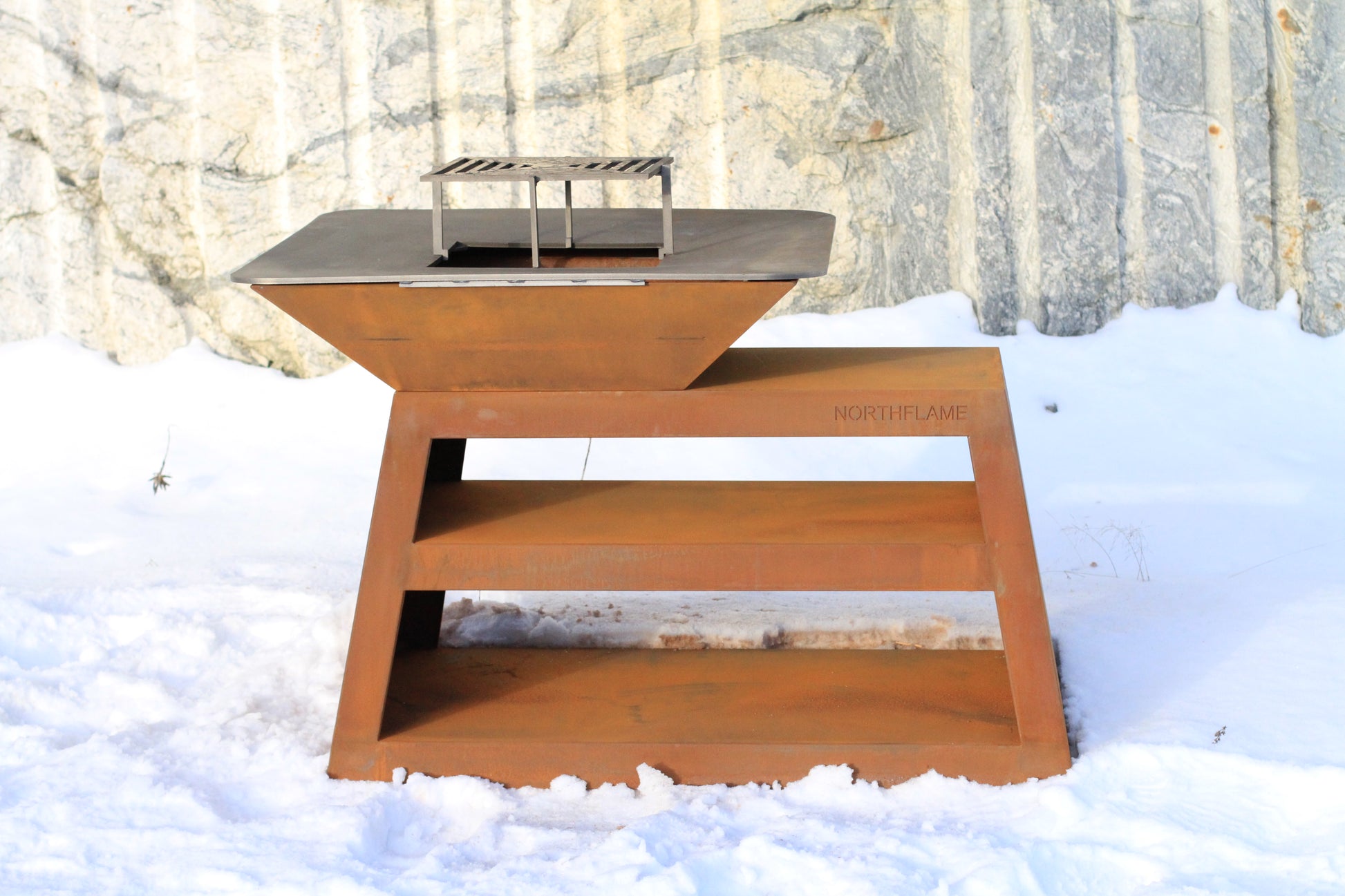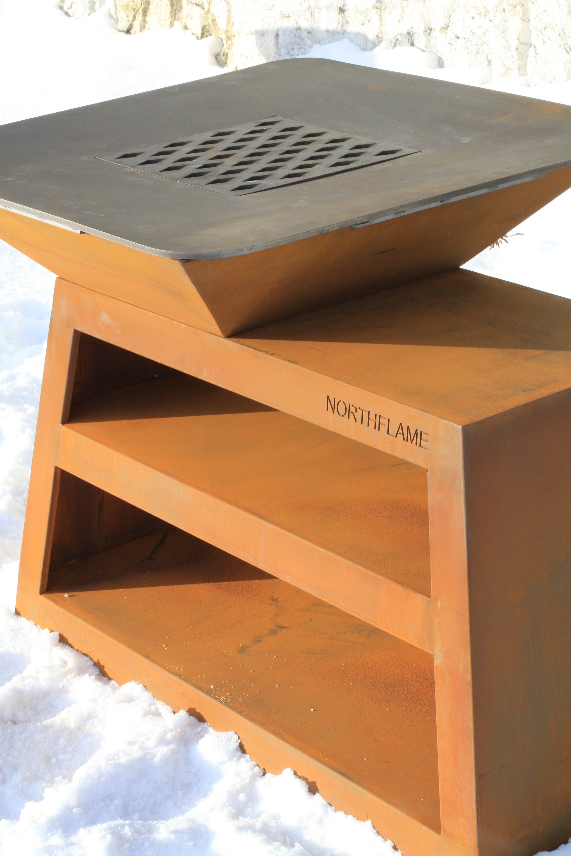 Materialer: Grillkonstruksjon i cortenstål. Kombinert grill- og stekeflate i stål.