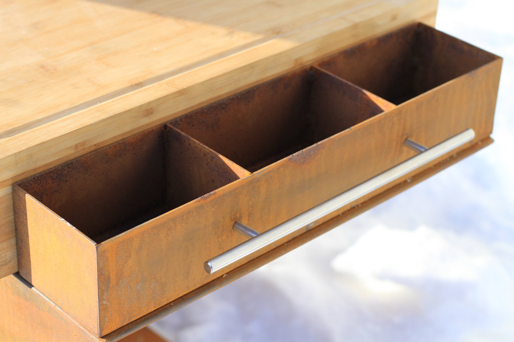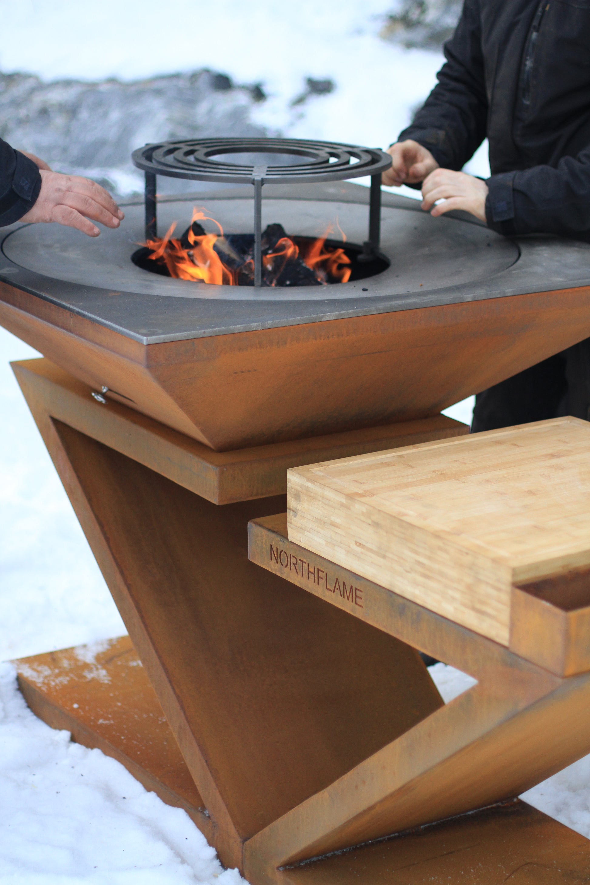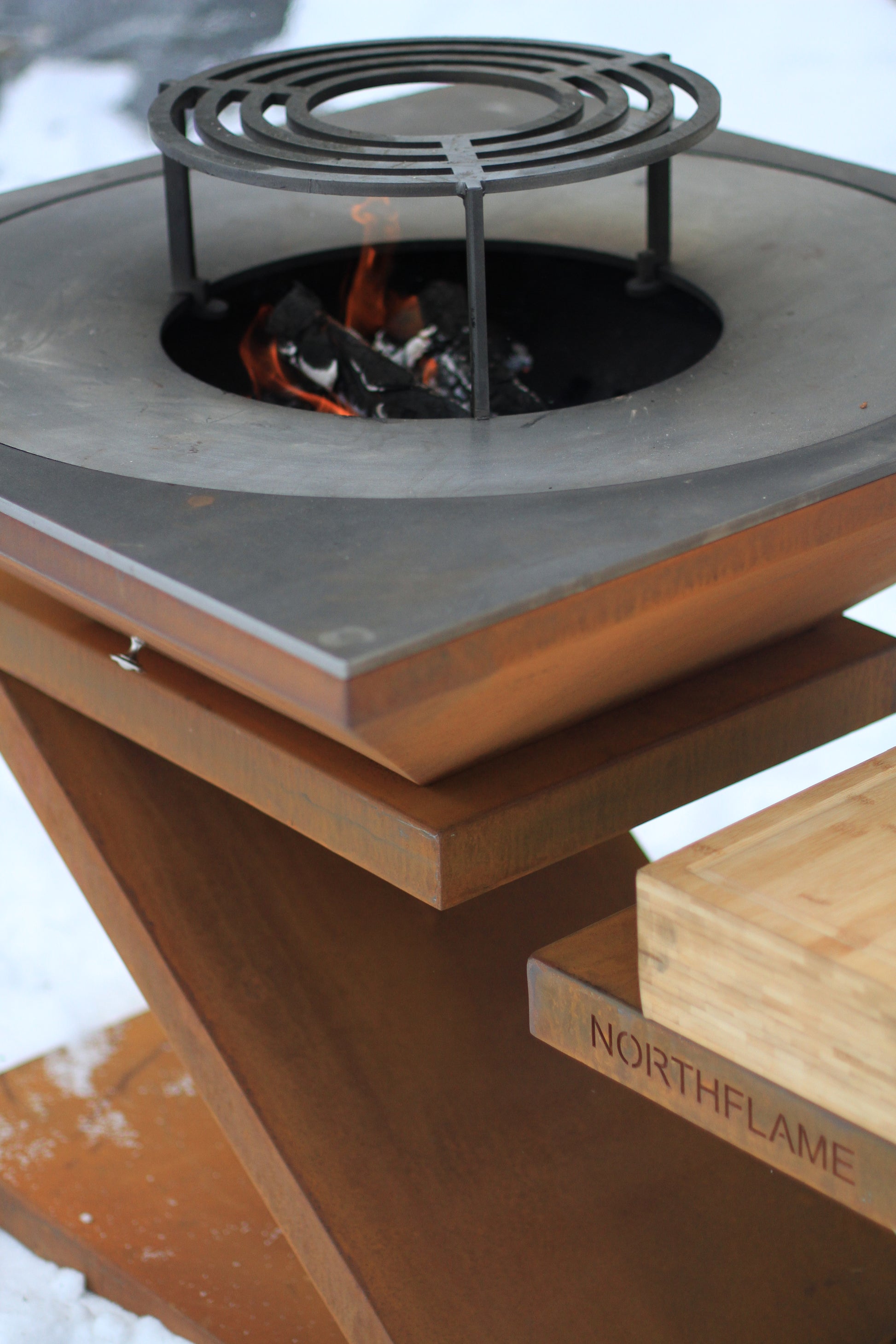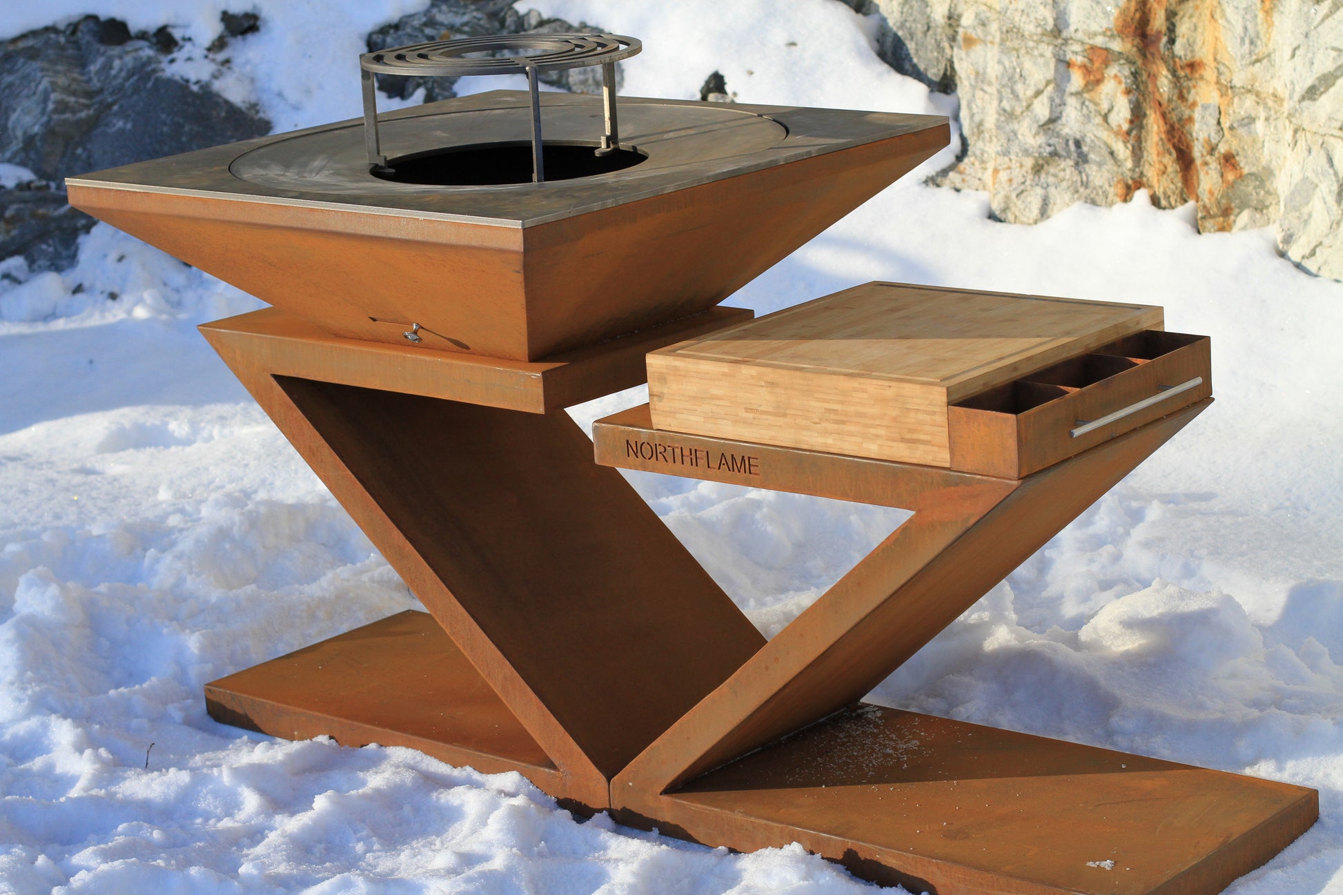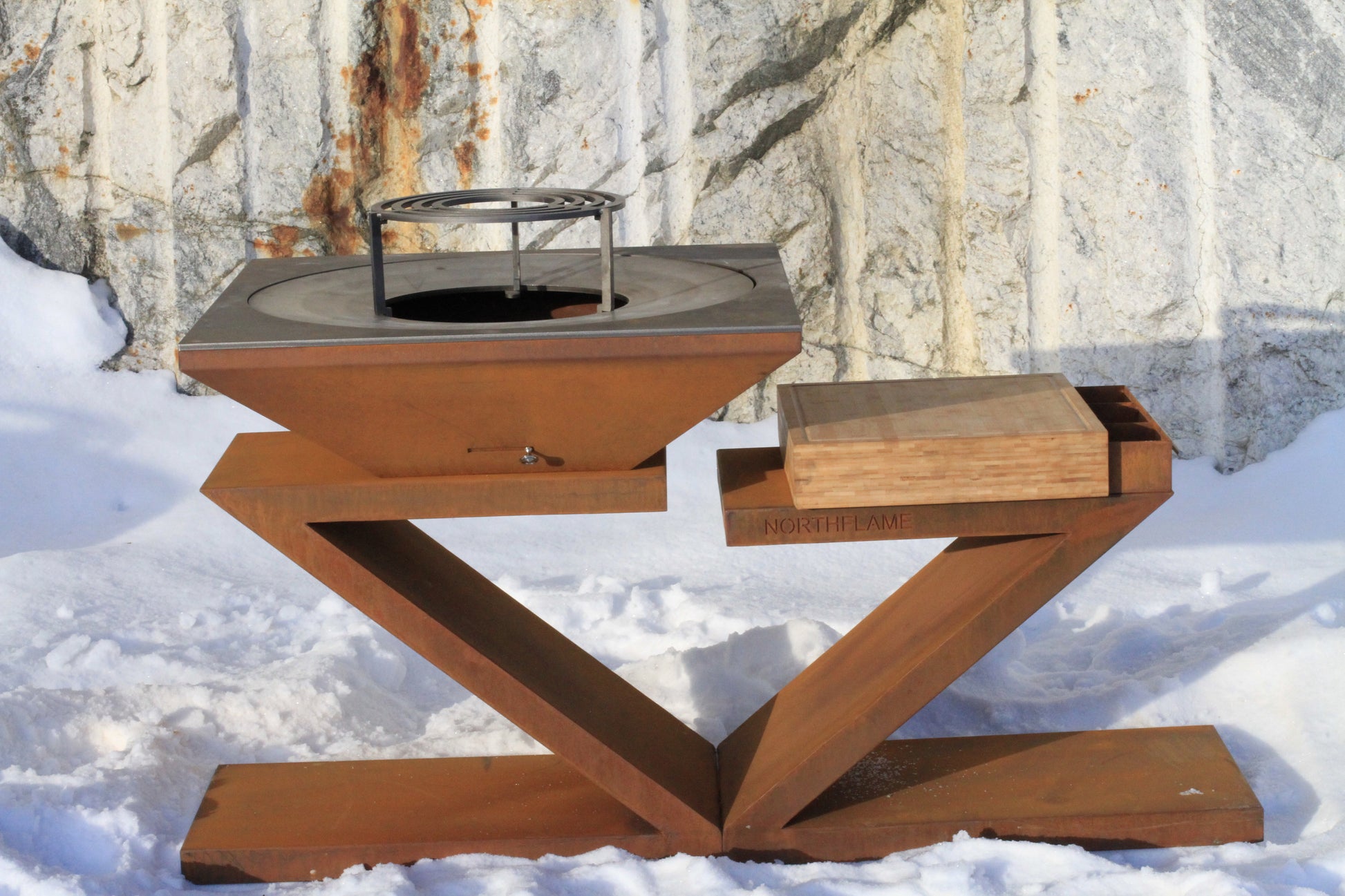 Materialer: Grillkonstruksjon i cortenstål. Kombinert grill- og stekeflate i stål.