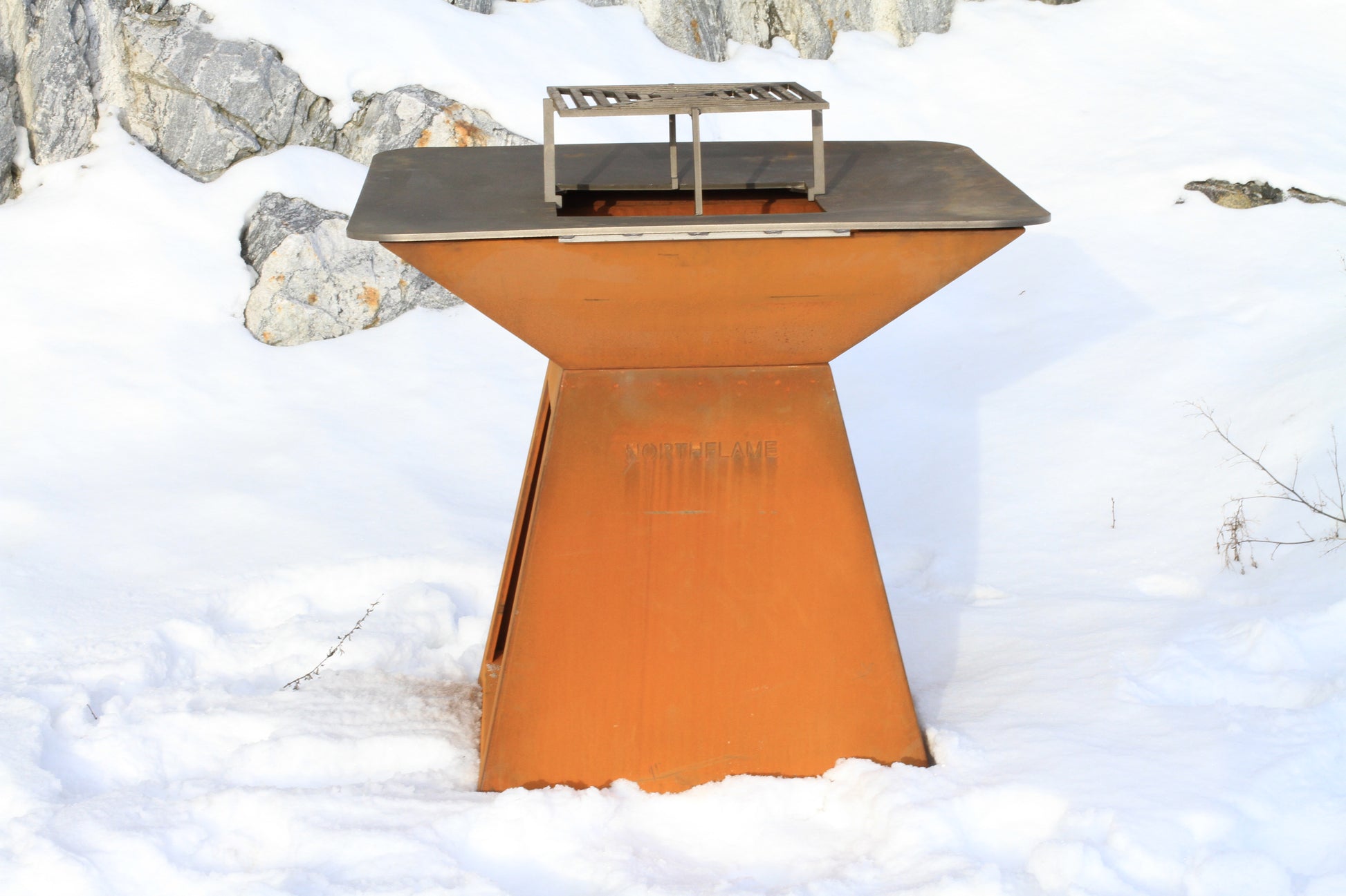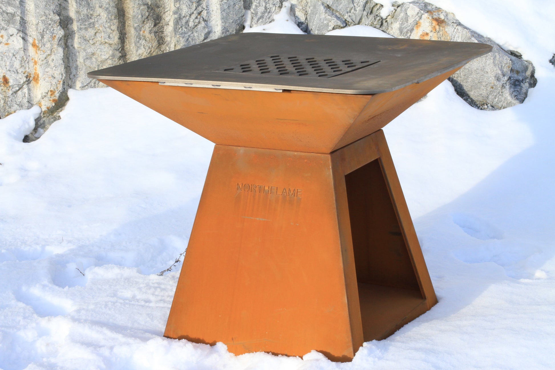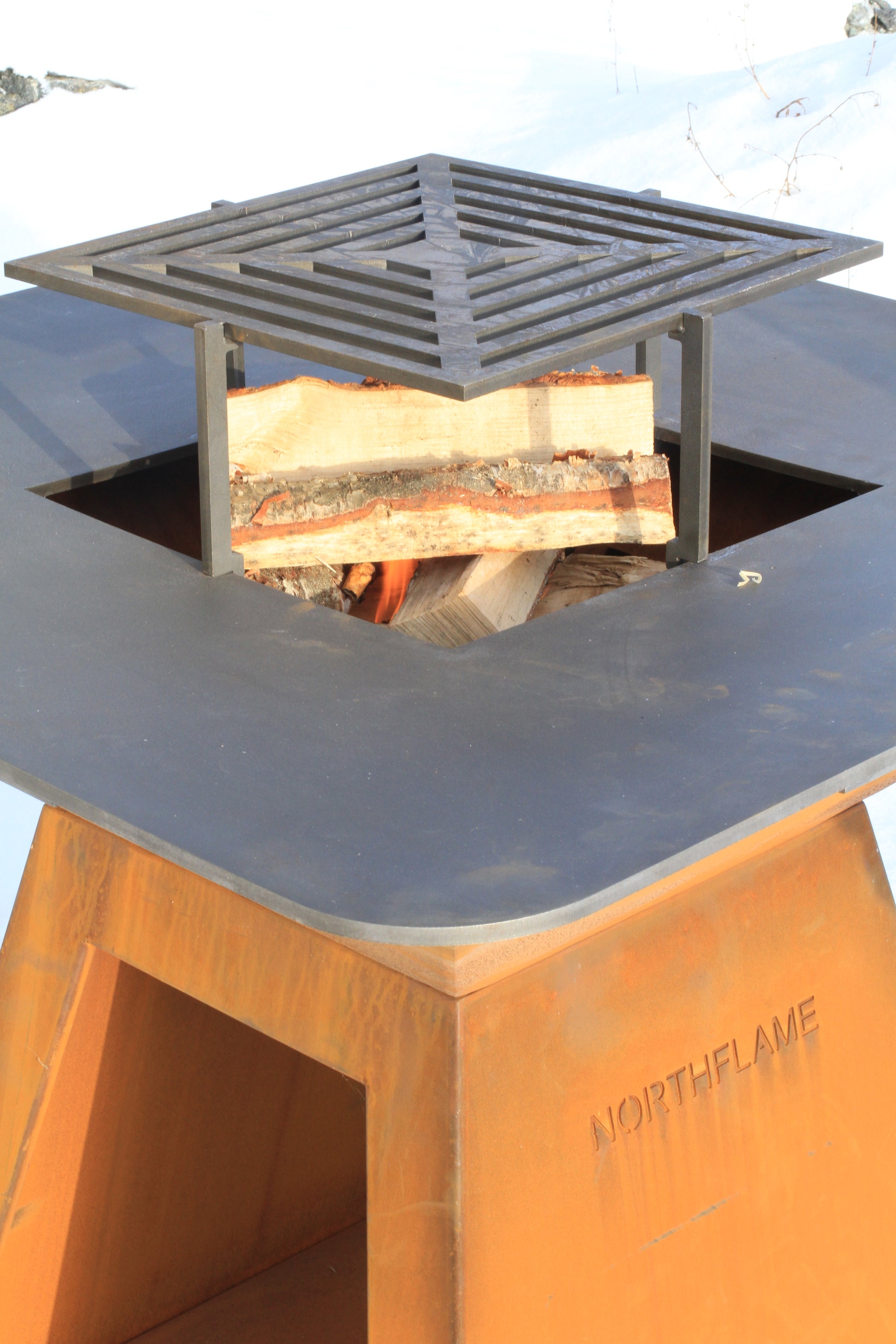 Materialer: Grillkonstruksjon i cortenstål. Kombinert grill- og stekeflate i stål.