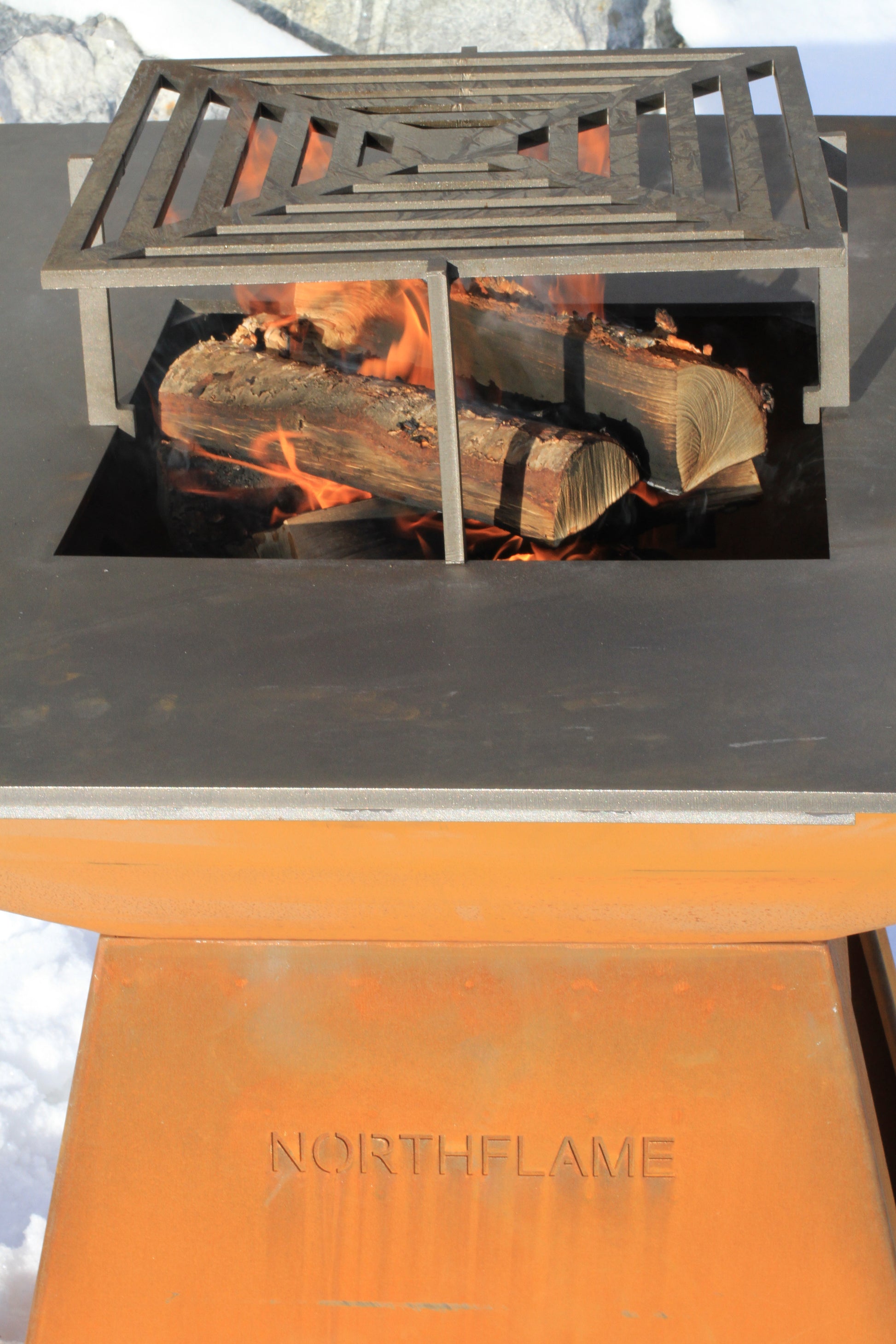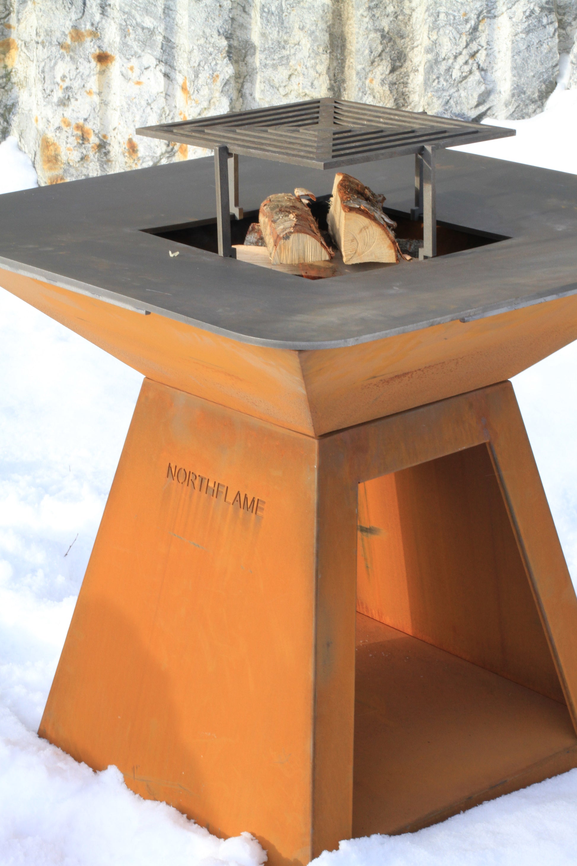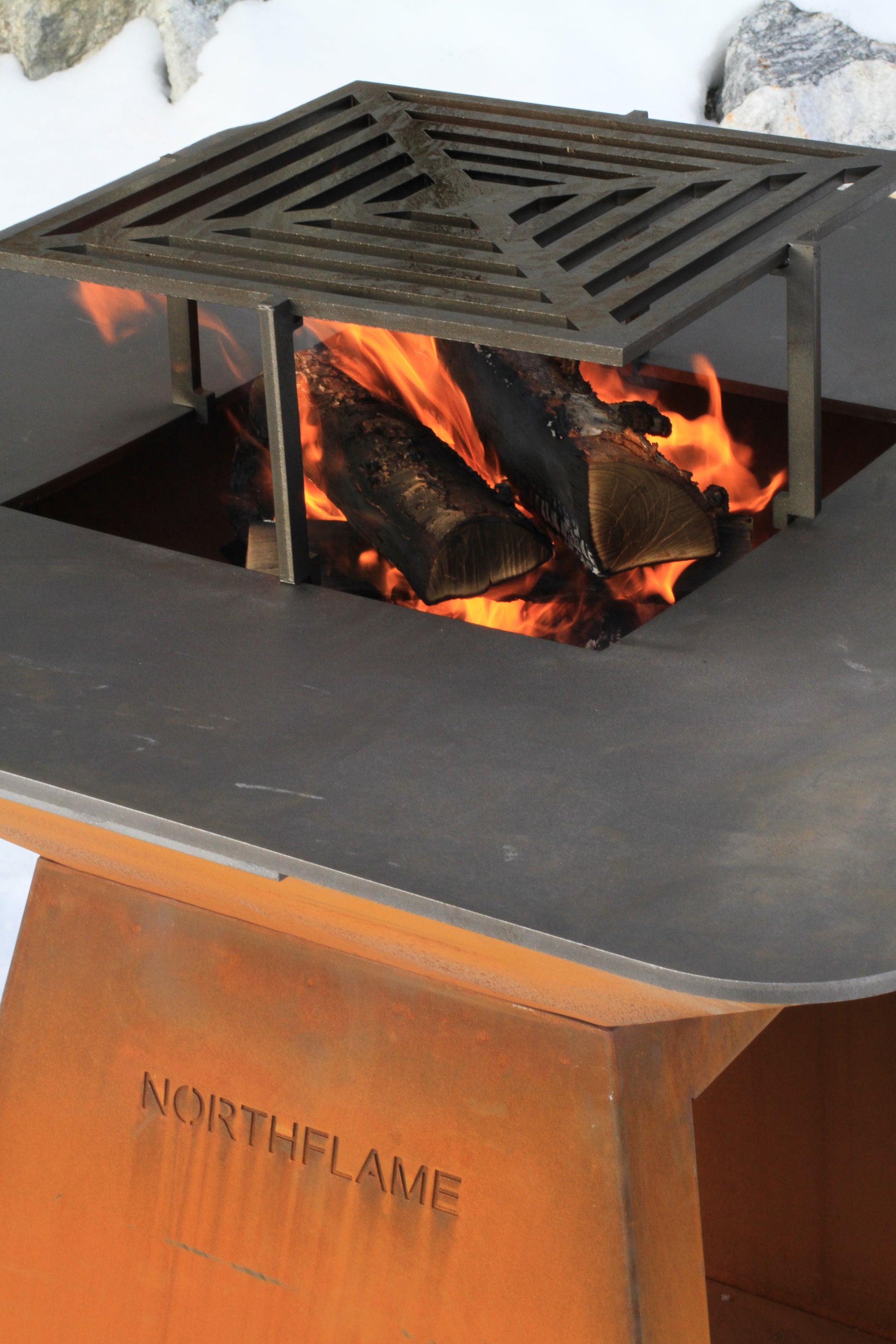 Materialer: Grillkonstruksjon i cortenstål. Kombinert grill- og stekeflate i stål.